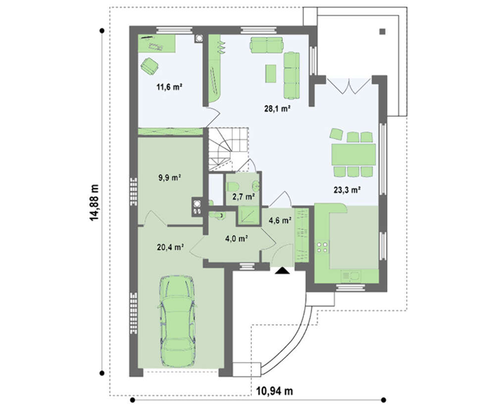 Проект содержит три раздела – Архитектурный, Конструктивный и Инженерный: водоснабжение, отопление, вентиляция, канализация, электроснабжение (приобретается за дополнительную плату) + Пояснительная записка.