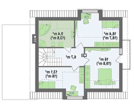 Ночная зона располагается на верхнем этаже. В ней находятся три спальни. Причем, в двух из них спроектированы большие мансардные окна. Это не только улучшает освещение комнат, но и добавляет комфорта за счет уменьшения площади скошенных стен. А в самой большой спальне есть выход на собственный небольшой балкон, надстроенный над эркером.