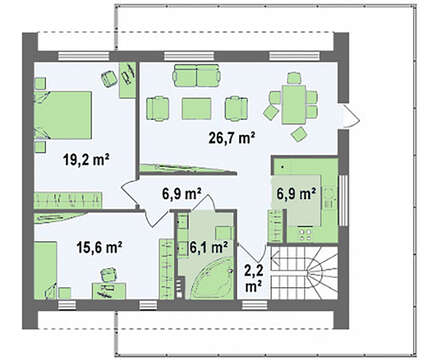 Разделение первого этажа на зоны выполнено рационально, за счет чего получена жилая комната и большое жизненное пространства для сборов всей семьи вместе. Предусмотрено много нужных подсобных помещений для размещения всех необходимых вещей для ведения загородного образа жизни.