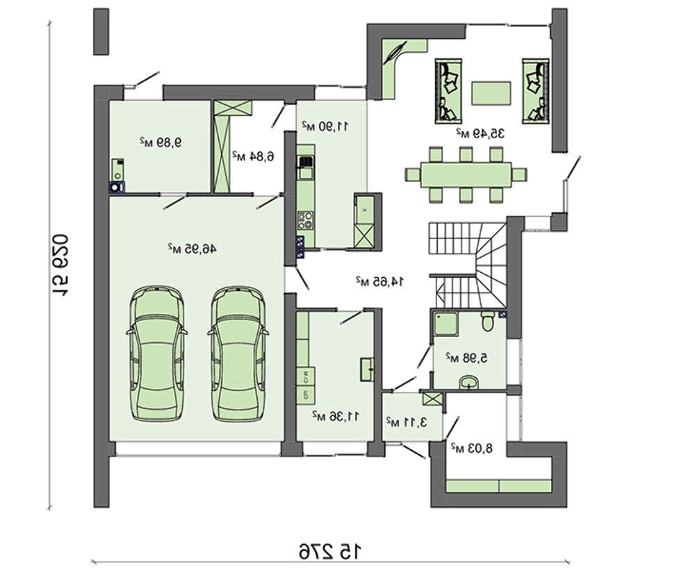 Внутри дом просторный. Первый этаж занимает территория дня. Здесь расположились технические помещения и вспомогательные комнаты. Расширяет территорию нижний цокольный уровень. Огромная площадь в 86 кв. м. используется на усмотрение владельца дома. Это может быть биллиардная и качалка с тренажерами, кладовая для хранения урожая и винный погребок, сауна и спортзал.