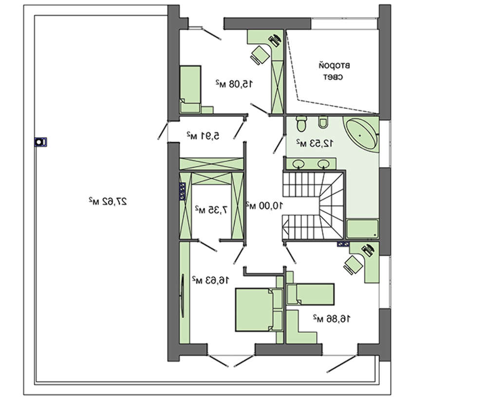 Верхний уровень отдан под личные спальни жильцов дома. Его изюминкой считается терраса на кровле гаража с общим входом. В теплое время года здесь можно устраивать семейные чаепития и загорать, установив садовую мебель и шезлонги.