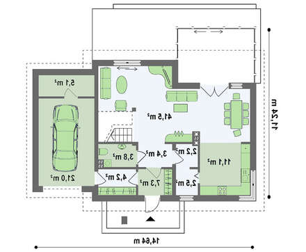 Дневная зона сложной формы представляет собой светлое открытое пространство. А то, что пространство единое, вам легко докажут ваши дети. Оказывается, расстояние из застекленной террасы через столовую в кухню составляет целых двадцать шесть шагов и еще немножко. А из гостиной мимо камина в столовую – двадцать три. Только пусть папа своими шагами не меряет, у него это расстояние меньше получается – всего-то пятнадцать шагов. Вот есть у него гараж, пусть его и меряет.