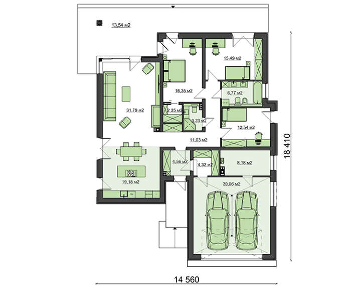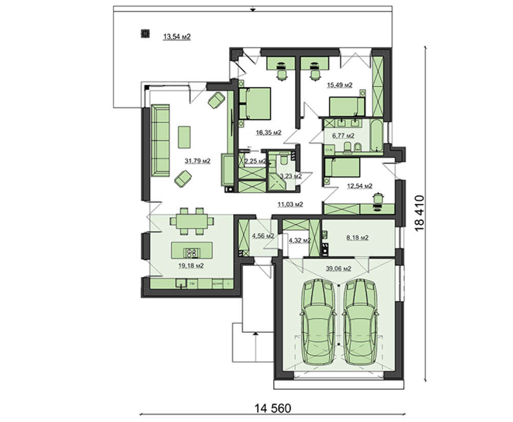 Проект содержит три раздела – Архитектурный, Конструктивный и Инженерный: водоснабжение, отопление, вентиляция, канализация, электроснабжение (приобретается за дополнительную плату) + Пояснительная записка.