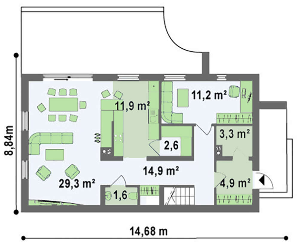 Проект содержит три раздела – Архитектурный, Конструктивный и Инженерный: водоснабжение, отопление, вентиляция, канализация, электроснабжение (приобретается за дополнительную плату) + Пояснительная записка.