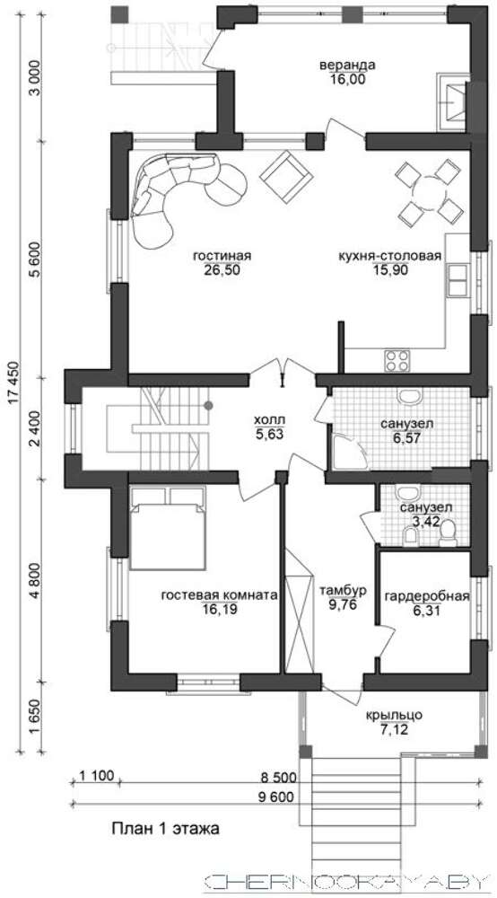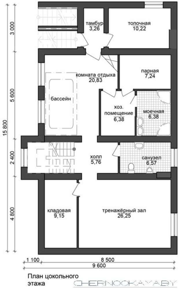 Проект содержит три раздела – Архитектурный, Конструктивный и Инженерный: водоснабжение, отопление, вентиляция, канализация, электроснабжение (приобретается за дополнительную плату) + Пояснительная записка.