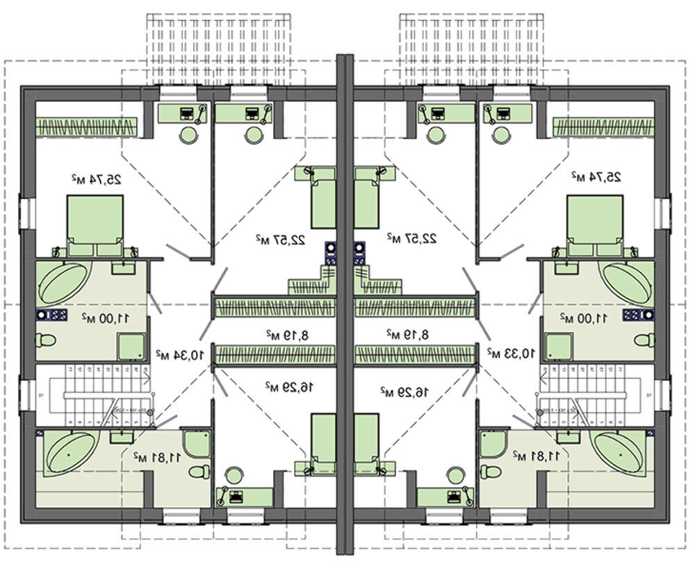 Проект двухквартирного таунхауса общей площадью 416 кв. м со встроенными гаражами 4M1444