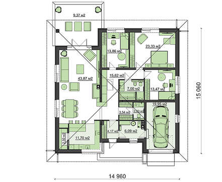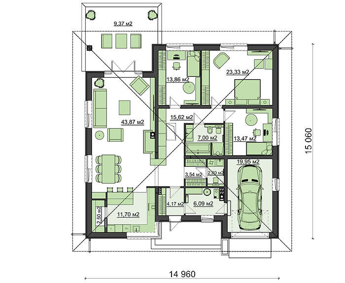 Проект содержит три раздела – Архитектурный, Конструктивный и Инженерный: водоснабжение, отопление, вентиляция, канализация, электроснабжение (приобретается за дополнительную плату) + Пояснительная записка.