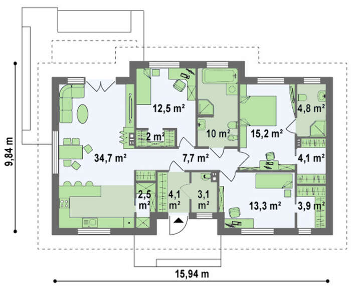Проект содержит три раздела – Архитектурный, Конструктивный и Инженерный: водоснабжение, отопление, вентиляция, канализация, электроснабжение (приобретается за дополнительную плату) + Пояснительная записка.