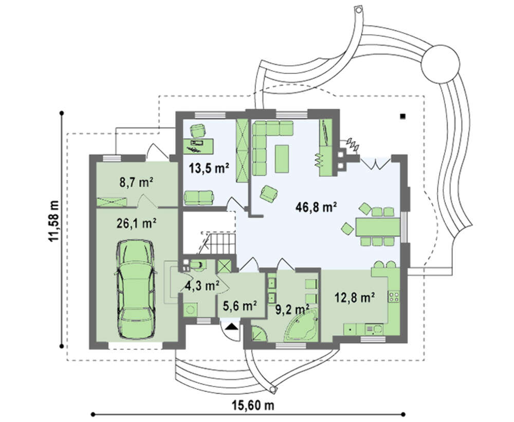 Проект содержит три раздела – Архитектурный, Конструктивный и Инженерный: водоснабжение, отопление, вентиляция, канализация, электроснабжение (приобретается за дополнительную плату) + Пояснительная записка.