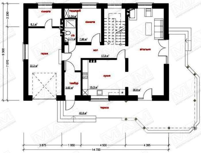 Проект содержит три раздела – Архитектурный, Конструктивный и Инженерный: водоснабжение, отопление, вентиляция, канализация, электроснабжение (приобретается за дополнительную плату) + Пояснительная записка.