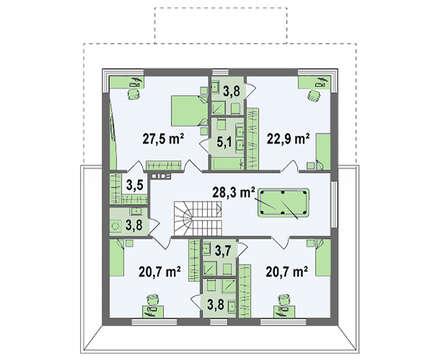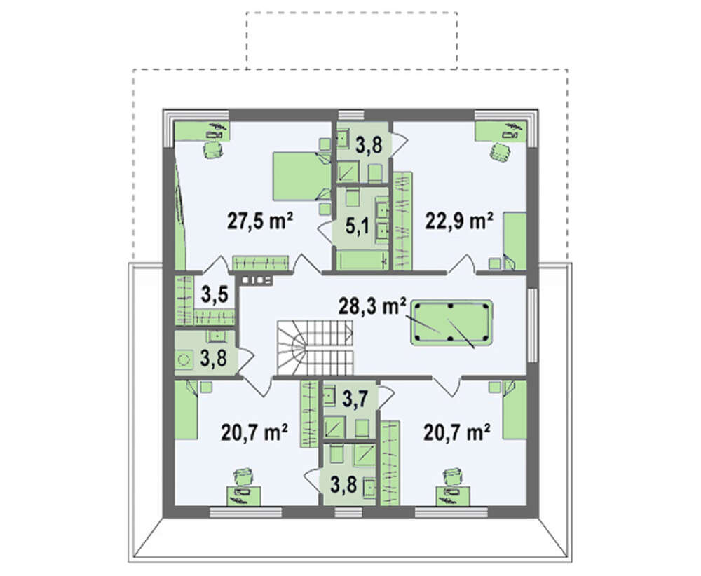 На площади четырех спален, расположенных в мансарде, проектировщики тоже не экономили. Каждая из них занимает не менее 20 м2 и обустроена собственным санузлом.