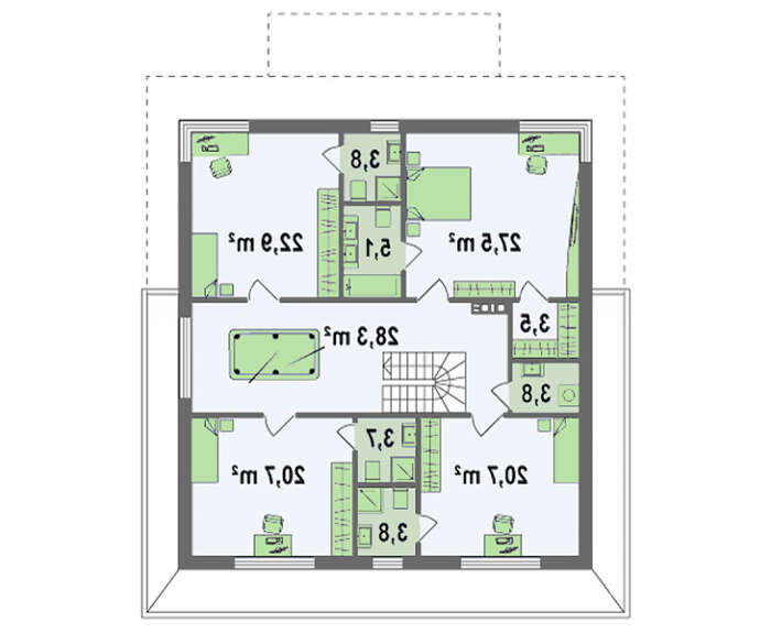 На площади четырех спален, расположенных в мансарде, проектировщики тоже не экономили. Каждая из них занимает не менее 20 м2 и обустроена собственным санузлом.
