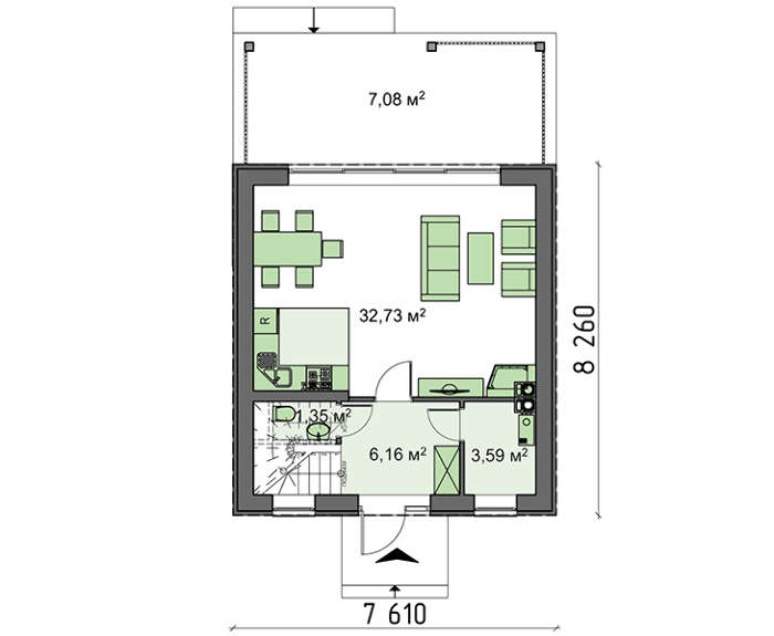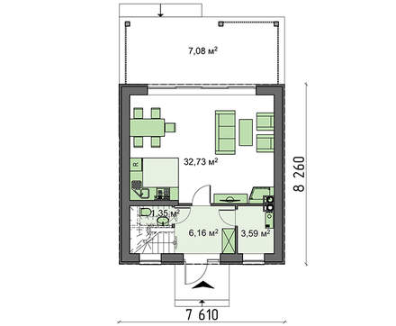 Небольшие размеры здания не влияют на его комфортность. Жилье имеет все необходимое для приема гостей и полноценного отдыха. На площади первого этажа, объединив вместе кухню со столовою и гостиной, получили зону общего времяпрепровождения. Здесь уютно встречать друзей, угощать их вкусностями и вместе смотреть интересные передачи.