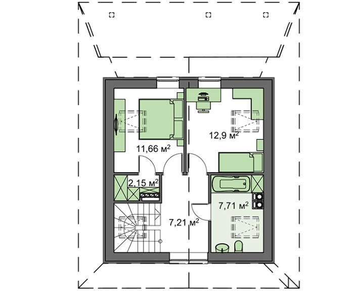 Второй этаж отдан под комфортный отдых. Спален две, они компактные, помещают всю требуемую для расслабления мебель и максимально настроены на полноценный отдых.