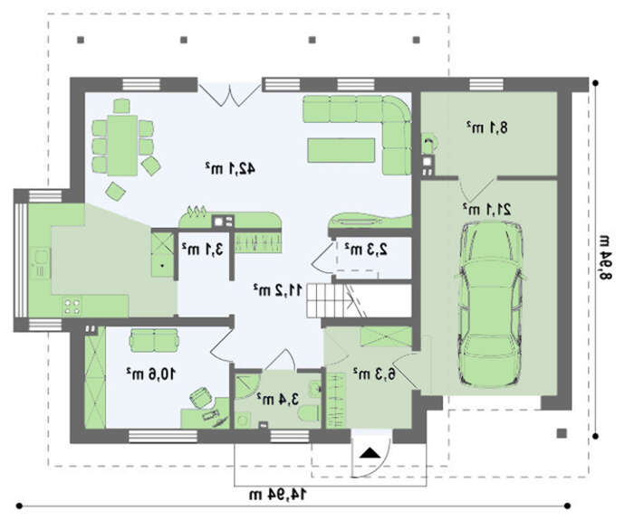 • 4M232 Проект компактного одноэтажного дома с террасой над гаражом