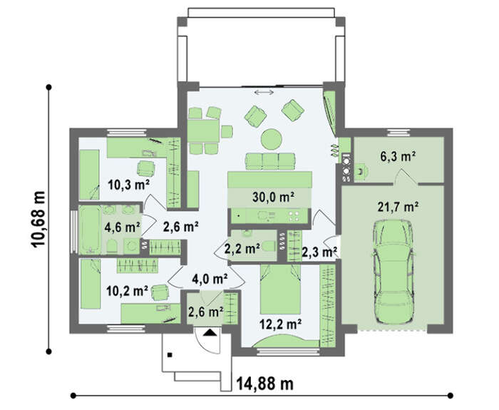 Проект небольшого одноэтажного дома интересного дизайна – уютный и практичный вариант жилья для семьи из четырех человек.