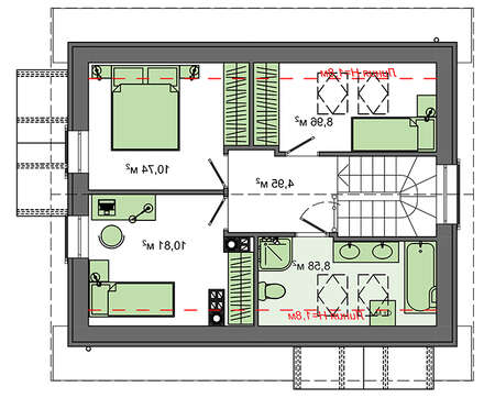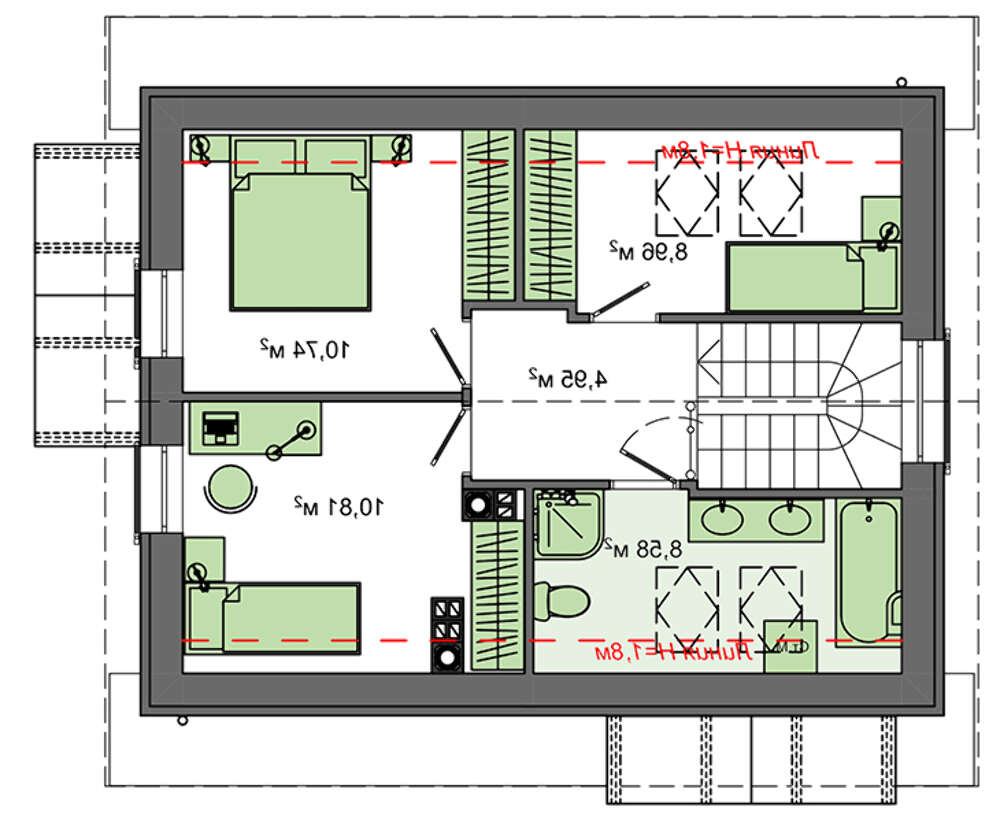Второй уровень поддерживает уже установленный минимализм интерьера. Небольшой этаж мансарды лишен всего лишнего, это позволило компактно разместить три спальни и общую санитарную комнату.