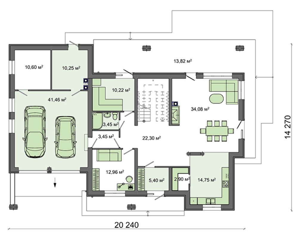 Планировка коттеджа предусматривает все необходимые жилые, подсобные и технические помещения. К тому же общая площадь почти в 300 кв. м. позволяет сделать их вместительными и просторными. Для личной территории предусмотрен целый этаж с комфортабельными спальнями. На нижнем уровне расположены помещения для работы и отдыха. Гостиная и мастерская, столовая и котельная, кабинет и кухня, а также просторный гараж для двух автомобилей.