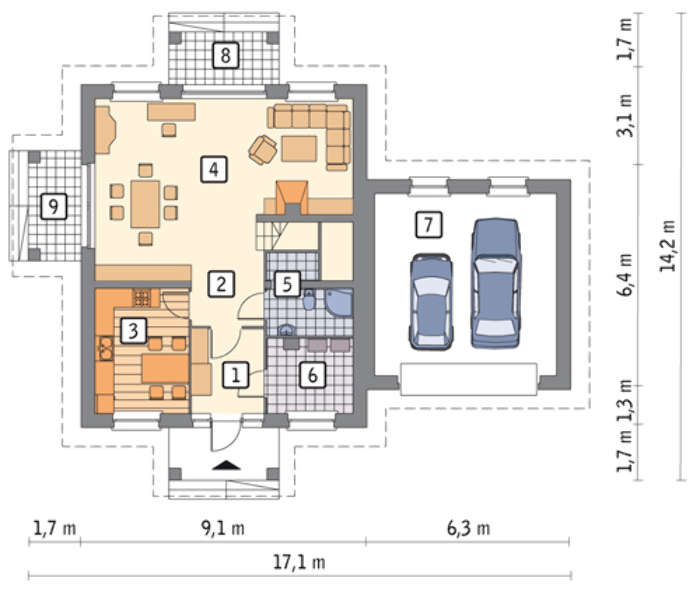 Проект содержит три раздела – Архитектурный, Конструктивный и Инженерный: водоснабжение, отопление, вентиляция, канализация, электроснабжение (приобретается за дополнительную плату) + Пояснительная записка.