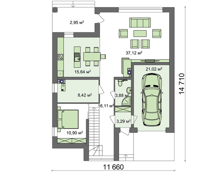 Еще одной особенностью этого дома является рациональность использования квадратных метров. Земля в наше время стоит дорого, а поэтому участки под застройку становятся все меньше и меньше. Но, потребности людей от этого меньше не становятся. Домик 4M611 вместил все, что надо для жизни семьи, причем немаленькой. Одних только спален в доме 5 штук. На втором этаже, вместе с 4-мя спальнями разместились две ванные комнаты. Для удобства, есть еще душевая на первом этаже. Просторная гостиная совмещена со столовой и открытой кухней. Здесь же есть выход на террасу под крышей. Еще одна терраса, поменьше, находится на втором этаже. В гараже есть подсобка, в которой можно хранить различные инструменты, канистры, запасные колеса…. Рядом с кухней есть кладовая, что очень удобно, особенно при открытой кухне