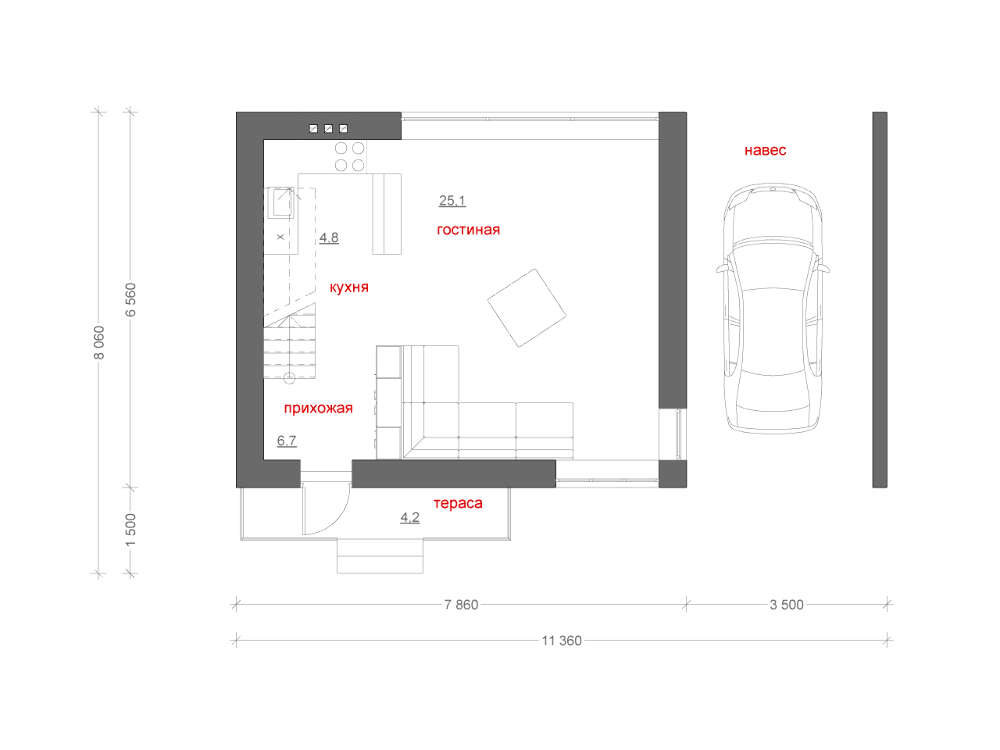 Проект содержит три раздела – Архитектурный, Конструктивный и Инженерный: водоснабжение, отопление, вентиляция, канализация, электроснабжение (приобретается за дополнительную плату) + Пояснительная записка.