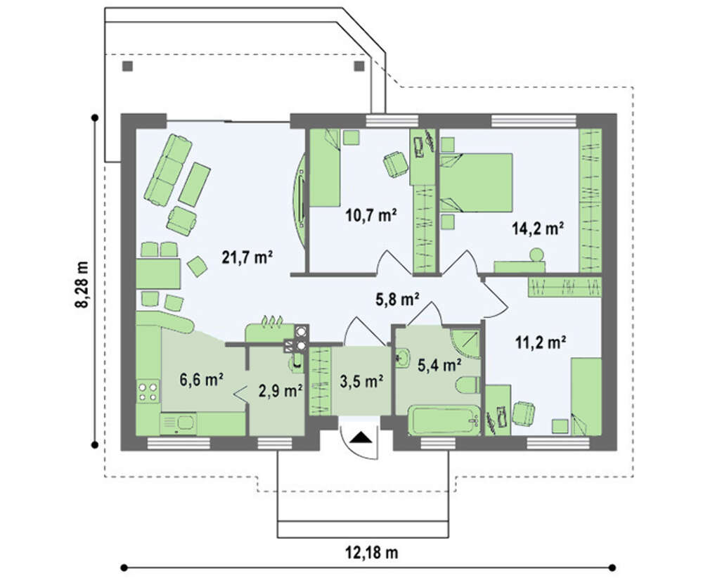 Проект содержит три раздела – Архитектурный, Конструктивный и Инженерный: водоснабжение, отопление, вентиляция, канализация, электроснабжение (приобретается за дополнительную плату) + Пояснительная записка.