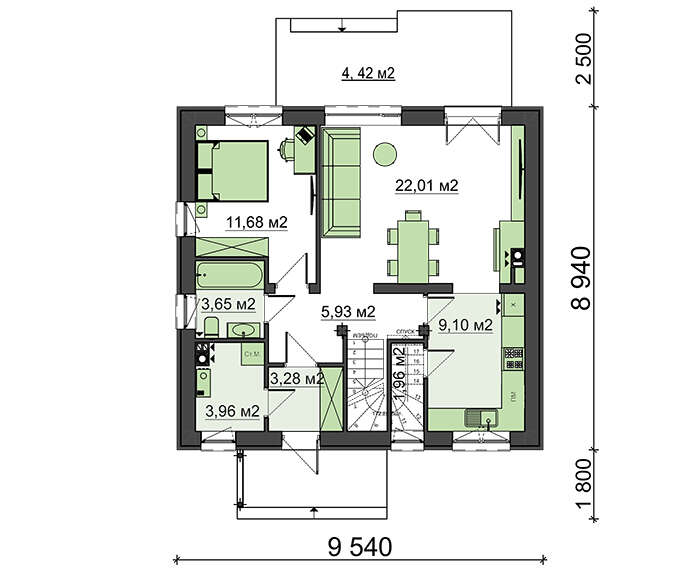 Проект содержит три раздела – Архитектурный, Конструктивный и Инженерный: водоснабжение, отопление, вентиляция, канализация, электроснабжение (приобретается за дополнительную плату) + Пояснительная записка.
