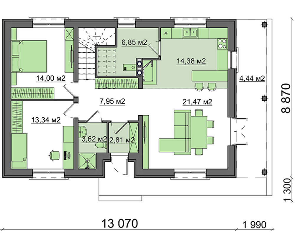 Проект содержит три раздела – АрхитектурныйКонструктивный и Инженерный: водоснабжение, отопление, вентиляция, канализация, электроснабжение (приобретается за дополнительную плату) + Пояснительная записка.