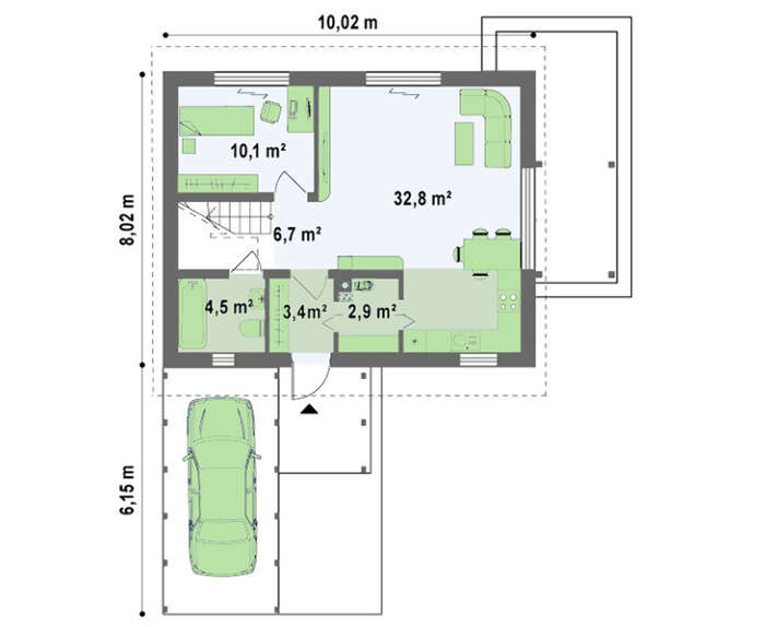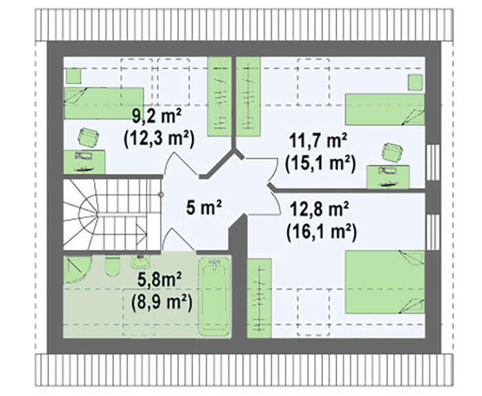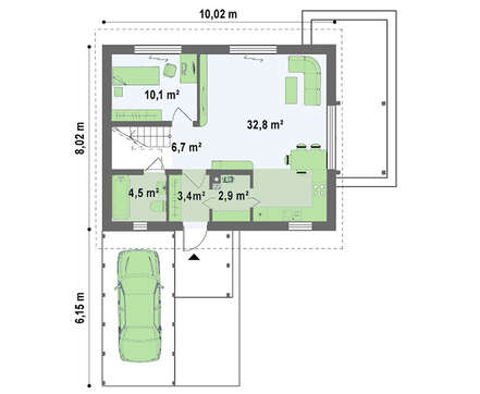 Современные строительные материалы и новые технологии позволили усовершенствовать мансарду, сделать ее еще комфортней и функциональней. В доме 4М194 обычная двускатная крыша прячет под собой мансардное помещение, а это, не мало, не много – 3 спальни и ванная комната. Наклонные окна делают комнаты солнечными и хорошо проветриваемыми. Небольшой аккуратный дом расположен в таком же аккуратном и ухоженном дворе: ровный газон, кустики и цветы, оформленные в клумбы. Для машины есть подъезд и парковочное место. Над ним стоит деревянный навес, который создает легкую тень. Навес хорошо подойдет для вьющихся садовых растений, таких как: кампсис, клематис, виноград или вьющаяся роза, которые, не просто украсят двор, но и усилят тень навеса.
