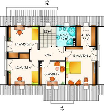 Четыре индивидуальные комнаты гарантируют полноценный спокойный отдых для всех членов семьи. Их небольших размеров вполне достаточно для компактного размещения необходимой мебели и оборудования. Особое внимание уделено хозяйским апартаментам. Преимущество пространства в большой гардеробной комнате.