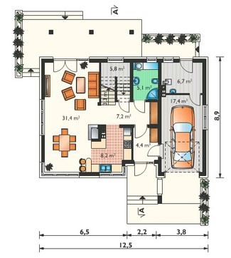 Дружелюбная настроенность строения подтверждается планировкой первого этажа. Практически вся его свободная часть использована для зоны дружеских приемов. Такие потребные помещения, как гостиная, столовая и кухня объединены в одну комнату. Предусмотрительно, чтобы не насаждать свои навязчивые запахи всему дому, кухонное пространство выполнено в полуобособленном варианте. Обустройство гаражного помещения внутри строения позволяет водителю выполнять все сервисные работы в комфортных условиях, а автомобиль надежно защитить от атмосферного влияния.
