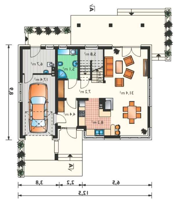 Дружелюбная настроенность строения подтверждается планировкой первого этажа. Практически вся его свободная часть использована для зоны дружеских приемов. Такие потребные помещения, как гостиная, столовая и кухня объединены в одну комнату. Предусмотрительно, чтобы не насаждать свои навязчивые запахи всему дому, кухонное пространство выполнено в полуобособленном варианте. Обустройство гаражного помещения внутри строения позволяет водителю выполнять все сервисные работы в комфортных условиях, а автомобиль надежно защитить от атмосферного влияния.