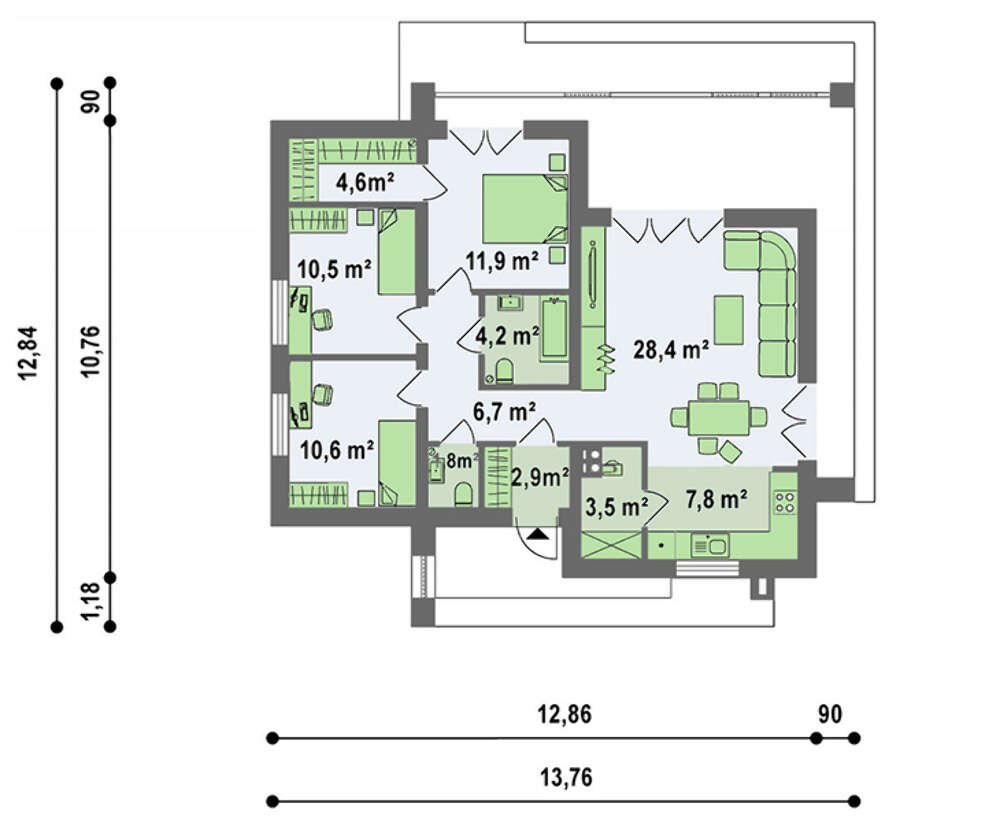 Такое счастье дарит своим жильцам небольшой одноэтажный коттедж с плоской кровлей. Его три спальни дают возможность отдохнуть и расслабиться. Двух санузлов вполне достаточно для ощущения комфорта. Большие пространства для совместного отдыха позволяют каждый день чувствовать себя на празднике.