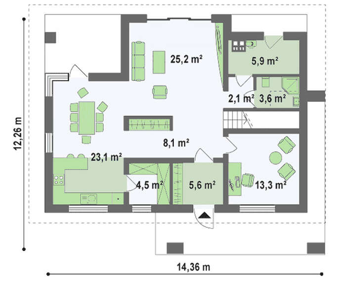 Обособленная комната первого этажа может быть использована на усмотрение дружной команды, проживающей под крышей этого строгого дома. Можно подарить пространство детворе и тогда здесь с утра до вечера будут расти замки из кубиков и звенеть игрушечные железные дороги. В своем кабинете рядом с семьею папа будет чувствовать себя увереннее и счастливее. Лучшее решение — доверить помещение под спальню бабушке и дедушке. Их уставшие ножки не всегда послушно взбираются на вторые этажи.