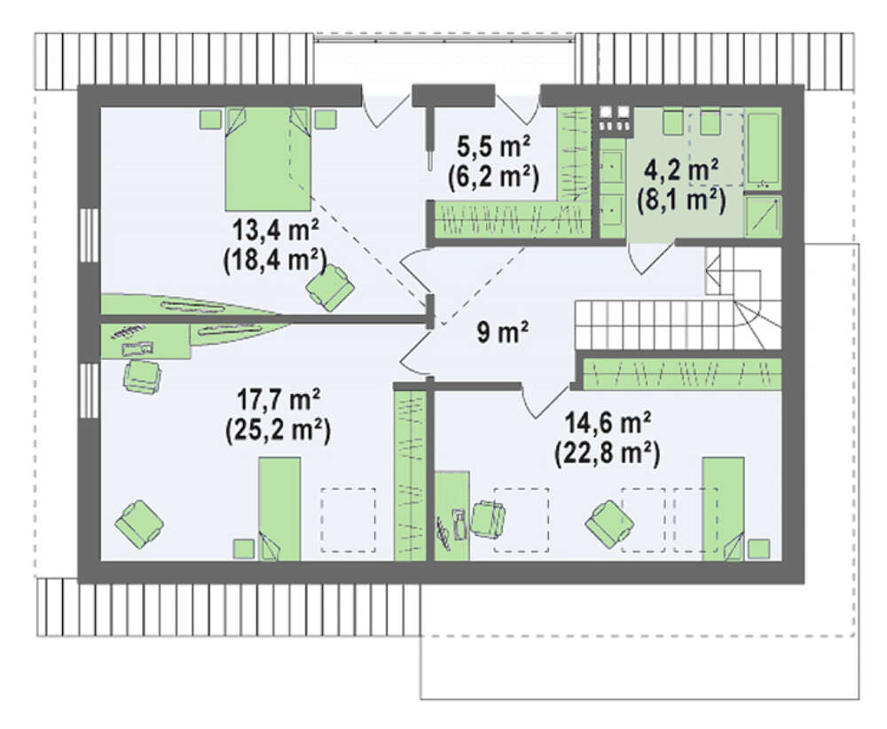 А вот мансарда — это личная территория молодежи. Самая лучшая комната — маме и папе. Большие вещи легко поместятся в просторном гардеробном помещении. Изящный балкон хорошее место, чтобы любоваться заходами солнца и отдыхать на природе, когда уставшая за день большая семья разойдется по своим помещениям