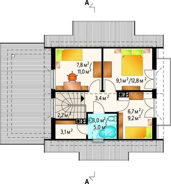 Второй этаж рассчитан на размещение трех спальных комнат. Удобная квадратная форма позволяет расставить всю необходимую мебель. Уютный балкончик разрешает хозяину апартаментов мечтать до бесконечности и беспрепятственно наслаждаться красотою природы в любое время дня и ночи.