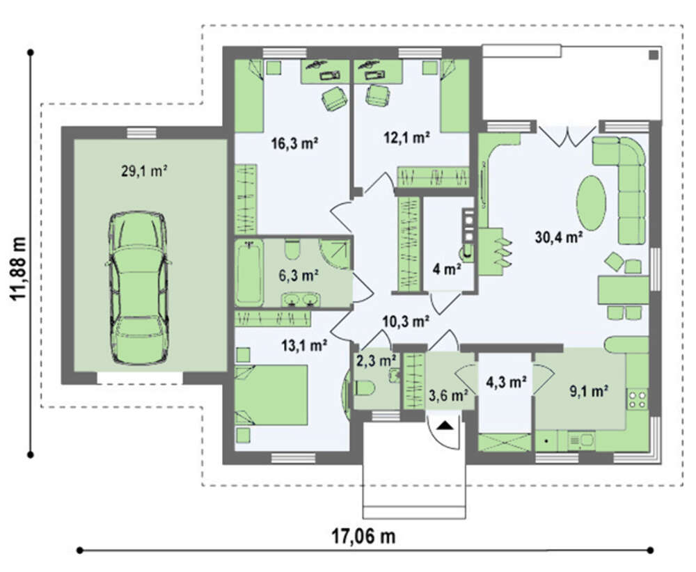 Проект содержит три раздела – Архитектурный, Конструктивный и Инженерный: водоснабжение, отопление, вентиляция, канализация, электроснабжение (приобретается за дополнительную плату) + Пояснительная записка.