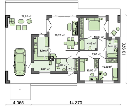 Жить в деревне хорошо, особенно летом. Вот только многие, почему-то считают, что в деревне домик должен быть до безобразия простым – избушка, не иначе. А как же удобства и эстетическое удовольствие? Одноэтажный дом 4M607 ломает все стереотипы. Этот дом - синтез комфорта простоты и, одновременно, загадочности. Ничего не пряча за высоким забором, дом полон загадок и укромных мест. Самым загадочным является гараж: его стены стеклянные, а сам гараж переходит в уютную террасу. При отсутствии в нем машины – не сразу и догадаешься, что это за помещение.