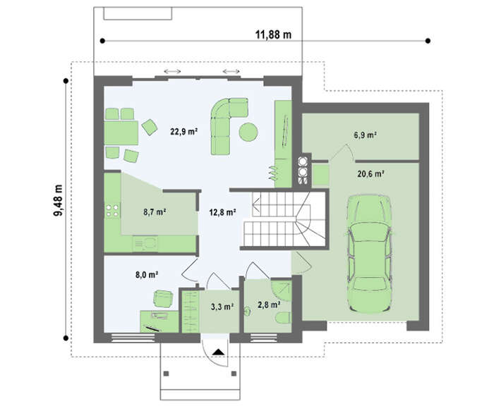 Проект одноэтажного дома с гаражом и зеленой кровлей