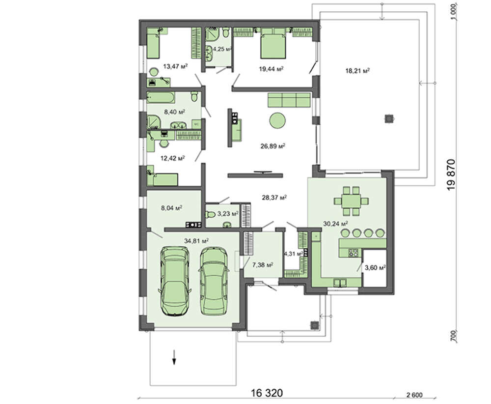 Симпатичный одноэтажный домик порадует застройщика, предпочитающего европейскую архитектуру. В нем все рационально и практично. Коттедж идеален для проживания 3-4 человек. Отсутствие вычурностей и излишеств делает дом стильным и элегантным.
