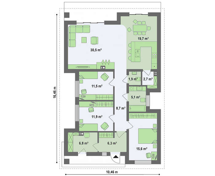 Проект содержит три раздела – Архитектурный, Конструктивный и Инженерный: водоснабжение, отопление, вентиляция, канализация, электроснабжение (приобретается за дополнительную плату) + Пояснительная записка.