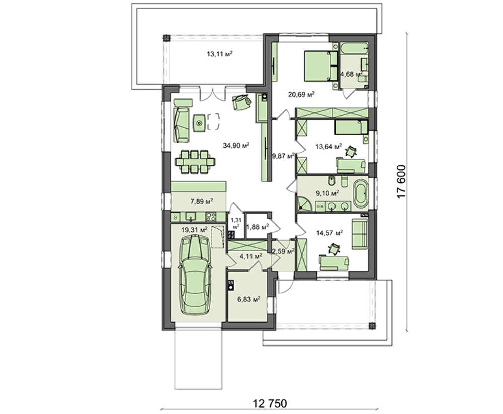Проект содержит три раздела – Архитектурный, Конструктивный и Инженерный: водоснабжение, отопление, вентиляция, канализация, электроснабжение (приобретается за дополнительную плату) + Пояснительная записка.