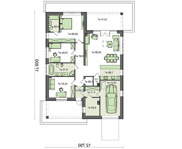 • 4M1463 Проект одноэтажного коттеджа площадью 164 кв. м в европейском стиле с тремя спальнями и гаражом