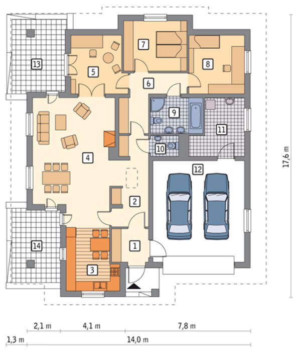 Проект содержит три раздела – Архитектурный, Конструктивный и Инженерный: водоснабжение, отопление, вентиляция, канализация, электроснабжение (приобретается за дополнительную плату) + Пояснительная записка.