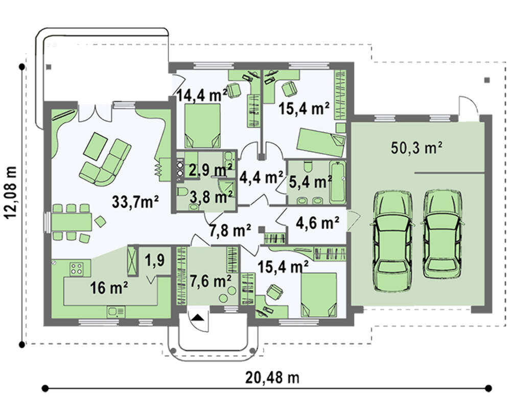 Проект одноэтажного коттеджа с гаражом в классическом стиле для двух автомобилей 4M512