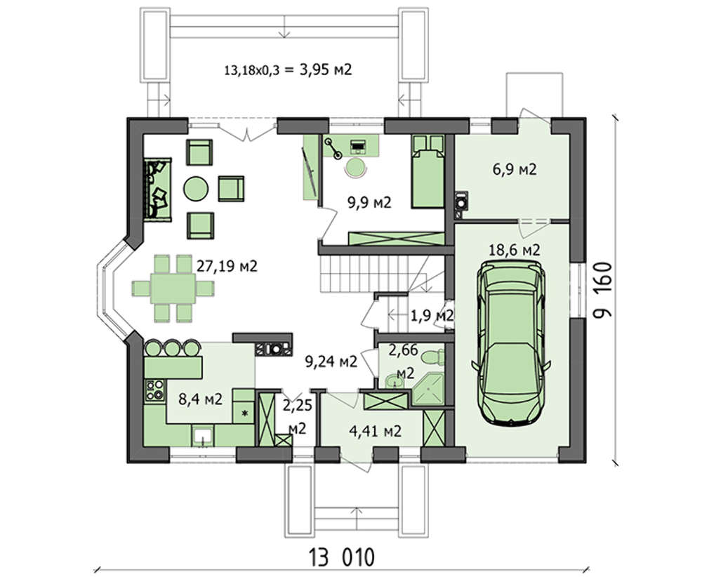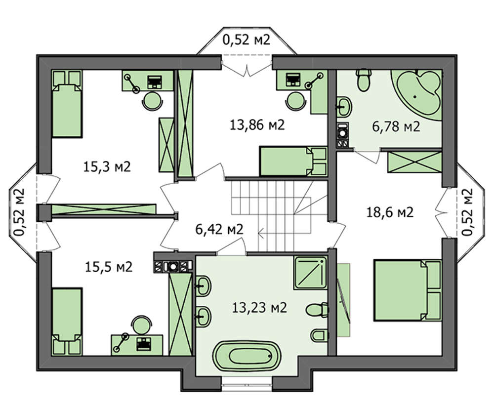 Проект содержит три раздела – АрхитектурныйКонструктивный и Инженерный: водоснабжение, отопление, вентиляция, канализация, электроснабжение (приобретается за дополнительную плату) + Пояснительная записка.