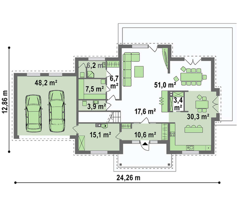Проект содержит три раздела – Архитектурный, Конструктивный и Инженерный: водоснабжение, отопление, вентиляция, канализация, электроснабжение (приобретается за дополнительную плату) + Пояснительная записка.