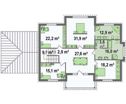 Второй этаж занимают три опочивальни и просторная ванная. Опочивальни весьма просторны, в них без труда могут разместиться шесть домочадцев.