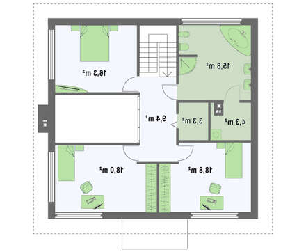 Ощущение открытого пространства на первом этаже создано благодаря широким окнам и второму свету. За счет этого достигается оптимальный уровень освещенности. Кроме того, помещения дневной зоны - гостиная, столовая и кухня – удачно дополняются крытой верандой.