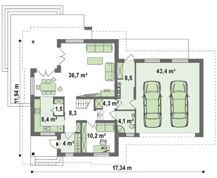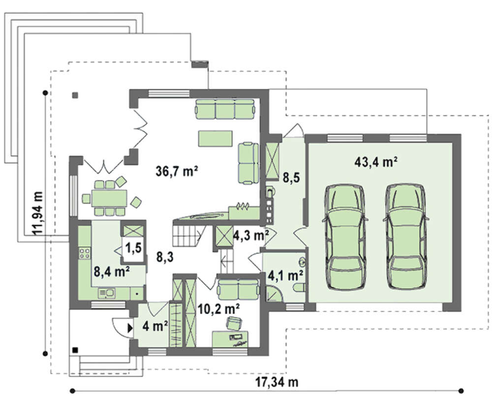 Проект содержит три раздела – Архитектурный, Конструктивный и Инженерный: водоснабжение, отопление, вентиляция, канализация, электроснабжение (приобретается за дополнительную плату) + Пояснительная записка.